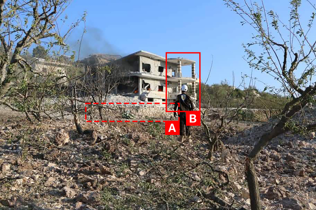 Reports of the incident mention a strike in the village of Al-Janoudiya (الجانودية). Analysing audio-visual material from sources, we have narrowed the location down to the following exact coordinates: 35.882219, 36.295548.
