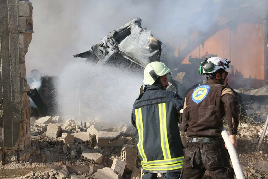 @SyriaCivilDefe tweeted that “two volunteers were injured (Anas Al Diab – Muhammad Al Sah) and the rest of the team survived after the #Civil Defense team was bombarded with cluster rockets, while working to inspect the targeted places and put out the fires, after airstrikes targeted the area of the city of Khan Sheikhoun in the southern countryside of Idlib this afternoon.”
