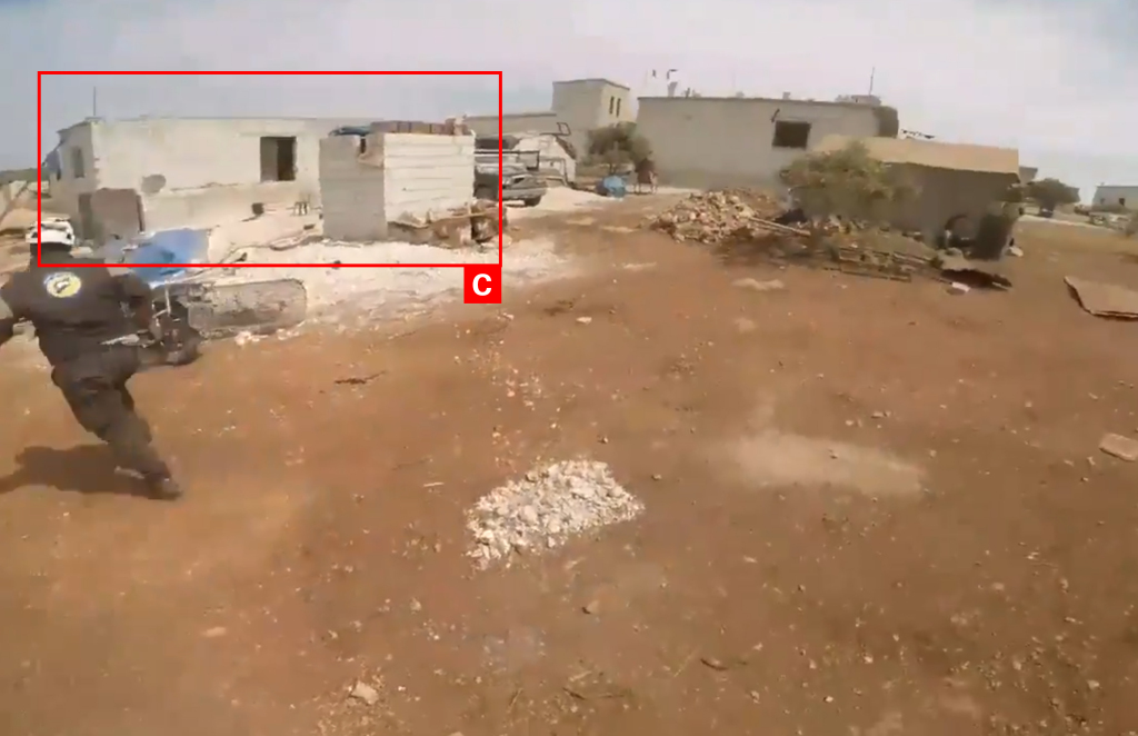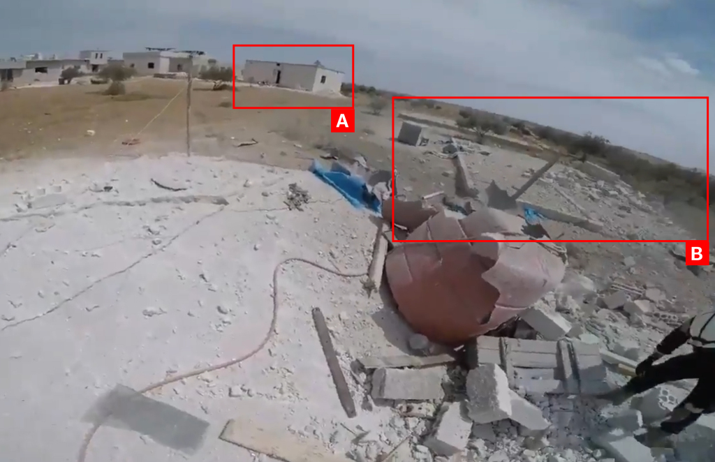 Reports of the incident mention a residential building being struck in the vicinity of Abdin (عابدين). Analysing audio-visual material from sources, we have narrowed the location down to the following exact coordinates: 35.480207, 36.541952.
