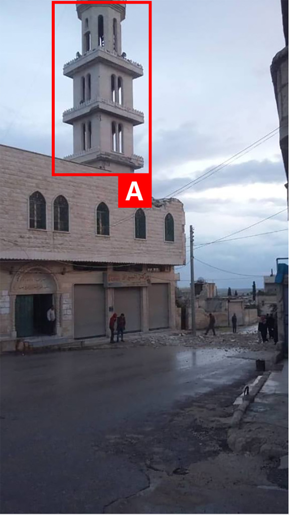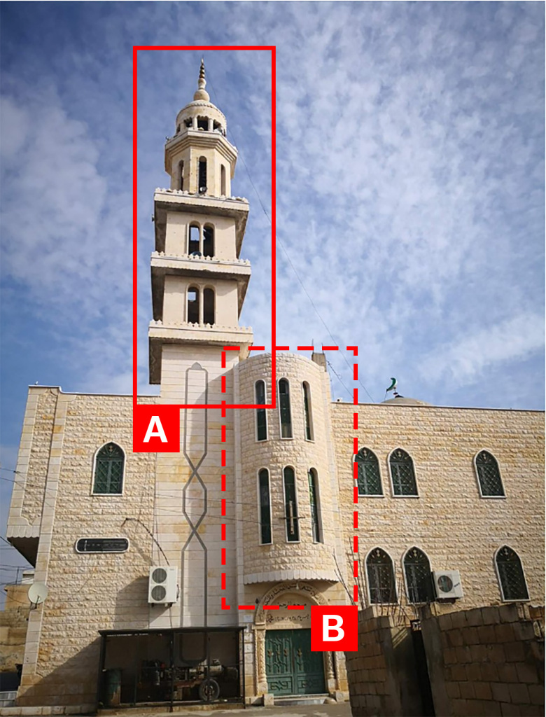 Reports of the incident mention the Al-Rahman Mosque (جامع الرحمن) being struck in Khan Sheikoun (خان شيخون). Analysing audio-visual material from sources, we have narrowed the location down to the following exact coordinates: 35.443593, 36.653057.