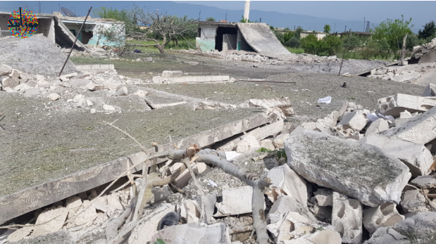 The Smart News Agency published an image of a house “destroyed on Saturday 27th April 2019, as a result of an aerial bombardment by Russia targeting the village”. Smart added that “Russian warplanes launched raids on residential areas in the village, killing five civilians and injuring two men and one woman, who were taken to a nearby hospital in the area.”