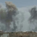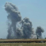 @aeinnews wrote that “the Syrian regime’s warplanes launch intense raids on the city of Al-Lataminah in the northern countryside of Hama, central Syria, this evening.”