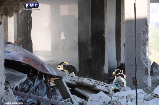 MMC posted pictures tagged: “The first moments of the targeting of the cities of Kafr Nabl and Hass in the southern countryside of Idlib with barrel bombs dropped from helicopters of the regime forces, which led to the deaths of martyrs and wounded civilians.”
