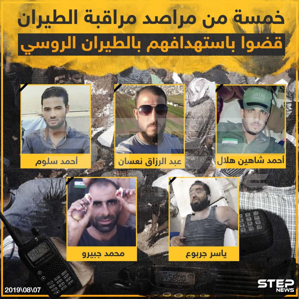 Geiroon reported that “five members of the monitoring unit team of the Al Naser Army, one of the components of the National Liberation Front were killed today, Wednesday, in a Russian airstrike targeting their headquarters, in Jabal Shashabo in the northwestern countryside of Hama.”