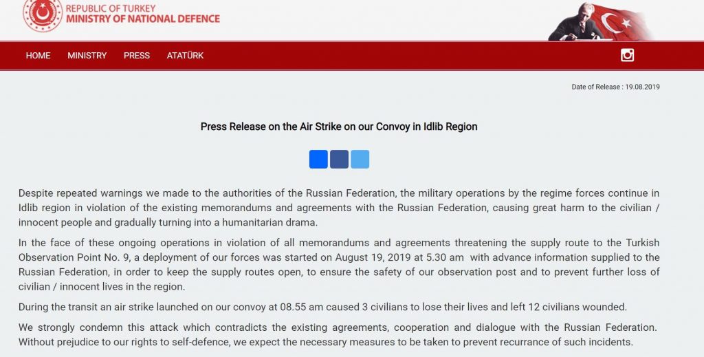 Reports of civilian deaths came from the Turkish military – in a statement first issued and then withdrawn. As Halab Today News noted, “The Turkish Ministry of Defense in a statement condemned the targeting of a military convoy belonging to it on Monday, by the regime forces, while heading to the ninth control point in the area of ”escalation reduction” south of Idlib. The Turkish Defense Ministry said that the regime forces targeted the Turkish military convoy heading to the observation point at 8:55[am], pointing out that it informed the Russian side of the destination of the convoy.