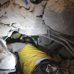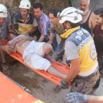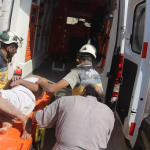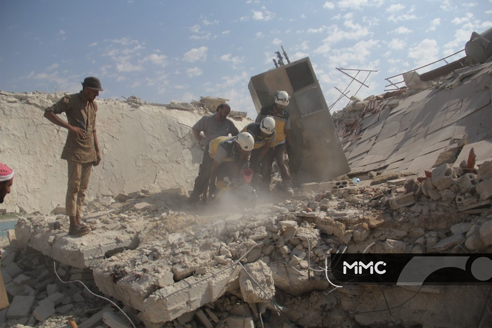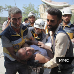 An image posted by @zamanalwsl shows the damage to buildings from the airstrikes and a wounded man being carried by rescuers. A tweet from @jisrtv reported that “civilians were wounded and trapped under the rubble as a result of air strikes” and a tweet from @NEDAAPOST specified that two people were trapped under the rubble. A video posted by @NEDAAPOST shows White Helmets rescuing a teenage boy from the rubble.