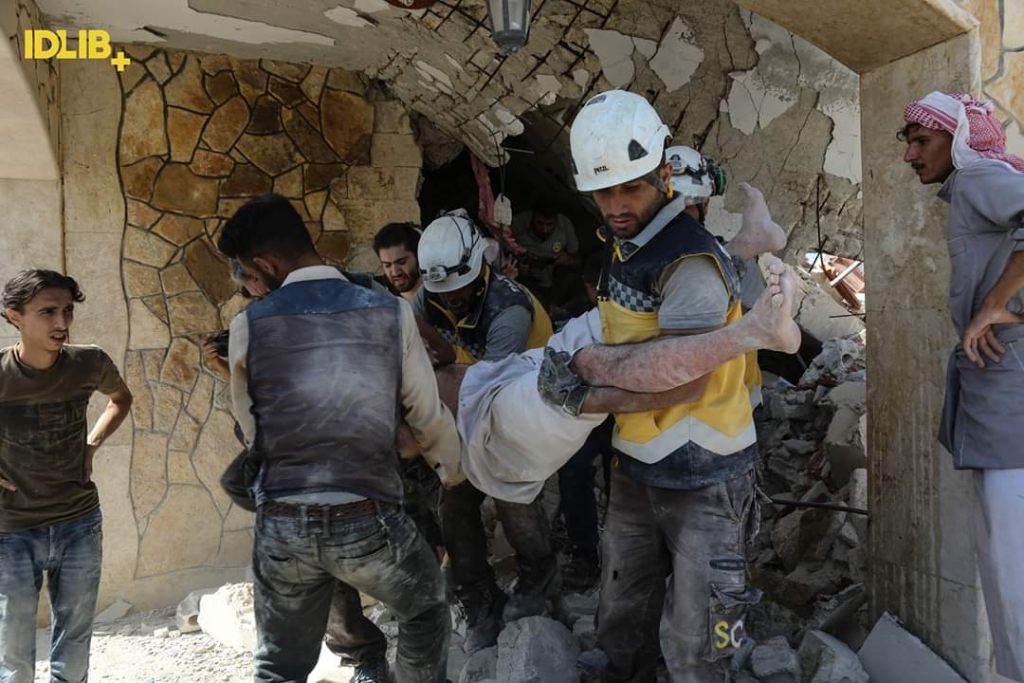 An image posted by @zamanalwsl shows the damage to buildings from the airstrikes and a wounded man being carried by rescuers. A tweet from @jisrtv reported that “civilians were wounded and trapped under the rubble as a result of air strikes” and a tweet from @NEDAAPOST specified that two people were trapped under the rubble. A video posted by @NEDAAPOST shows White Helmets rescuing a teenage boy from the rubble.