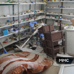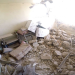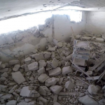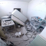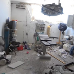 Videos posted by @HadiAlabdallah and @shaamnews show the moment of the strike and the aftermath of the strike on the hospital, which shows that the hospital was largely destroyed with the ceilings caved in and the equipment damages. There are also White Helmets shown in the videos removing the body of a victim.