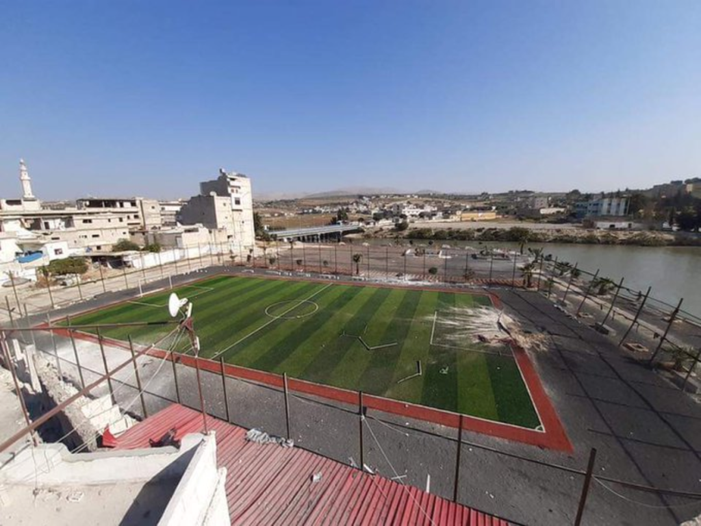 A tweet and image from @osama_sy87 shows an airstrike that hit the goal in a football stadium.