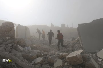 The Syrian Civil Defence (SCD) reported that their volunteers were targeted by Russian double raids while they were working to save civilians injured from earlier strikes. Video footage shows the SCD during their rescue operation, when two consecutive explosions hit the area while they were attempting to free victims from rubble.