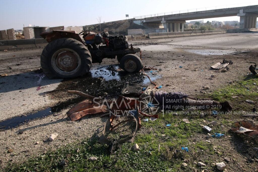 Eyewitnesses told Smart News Agency that “Russian warplanes targeted the cars of the displaced and an agricultural tractor carrying a displaced family and the furniture of its house in the city of Ma’arat Al Numan (32 km south of Idlib), killing two civilians and wounding another, as a result of which he was transferred to a nearby hospital.”