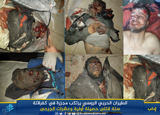 On January 31, the Syrian Network for Human Rights updated their initial death toll of 12 casualties to 19 casualties, stating that among them, four children and two women had died. A graphic image posted by @RoaaMediaNews shows the bodies of five men that were allegedly killed during the strikes on Kafar Lata.