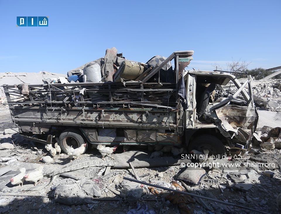 Witnesses told Smart News Agency that the Russian warplanes targeted a farm inhabited by displaced people from the Ma’arat Al Numan area, killing nine civilians and wounding 20. The Syrian Network for Human Rights reported that the farm was a poultry farm. According to SOHR, the victims are displaced people from Hama, Aleppo, and other areas of Idlib.