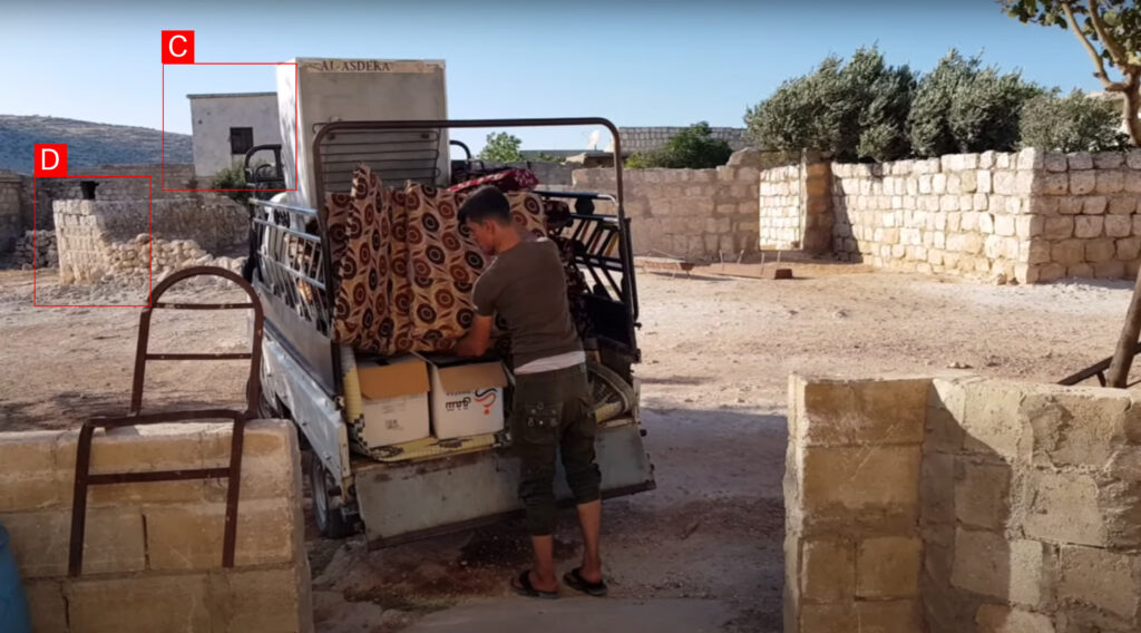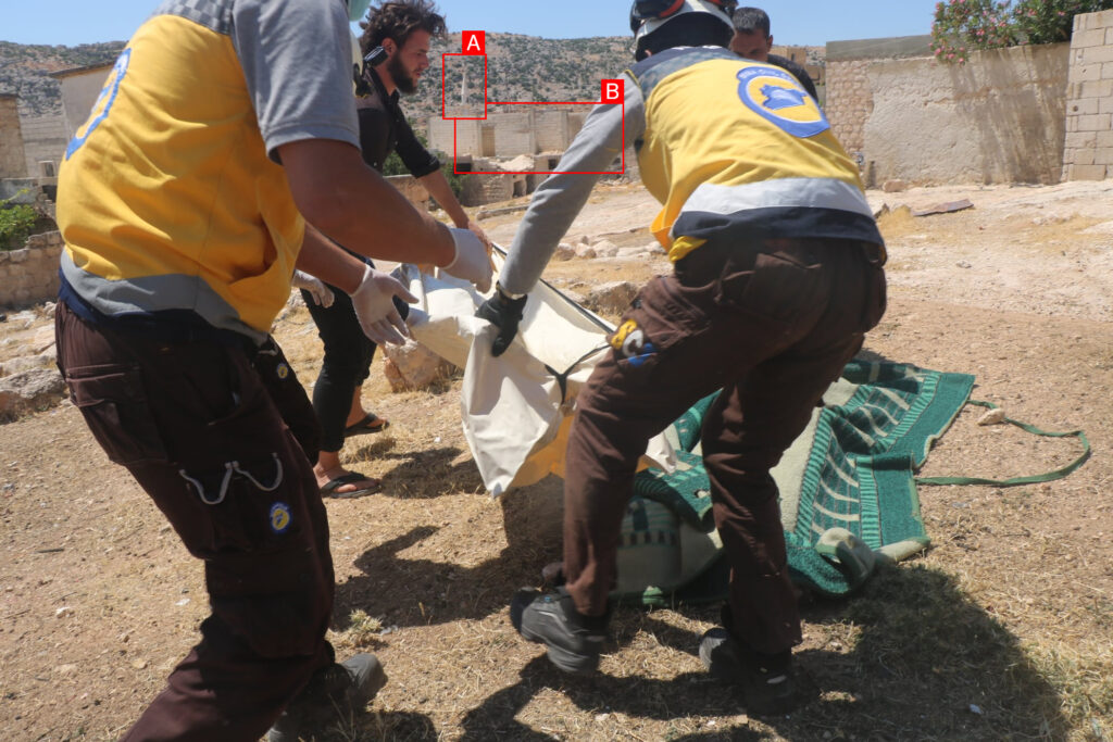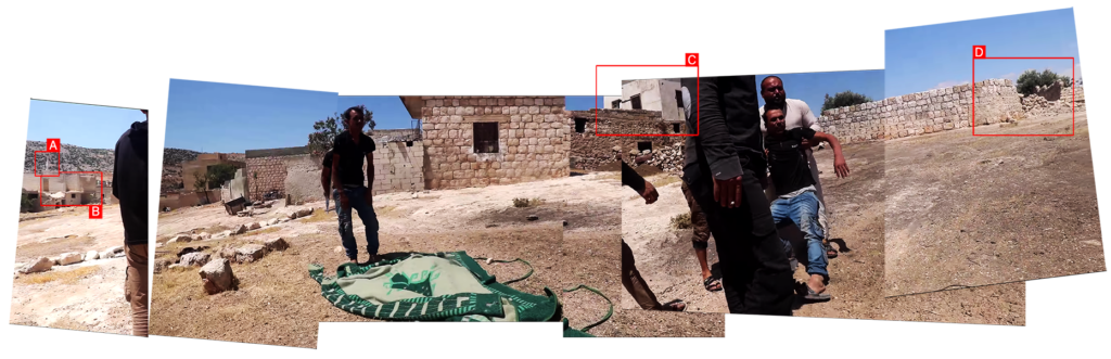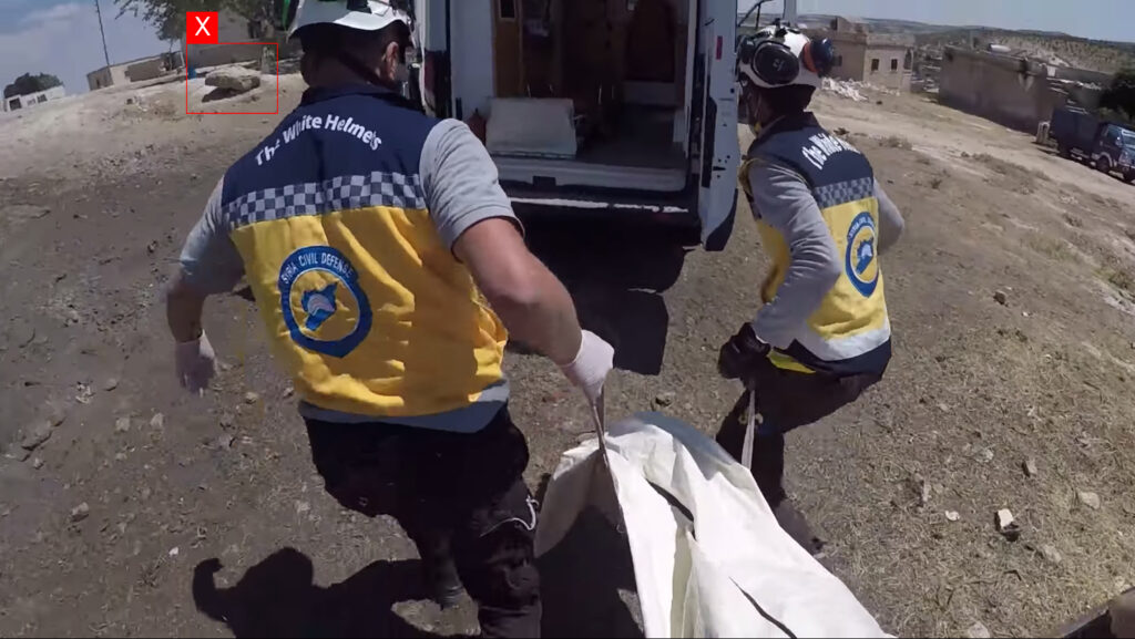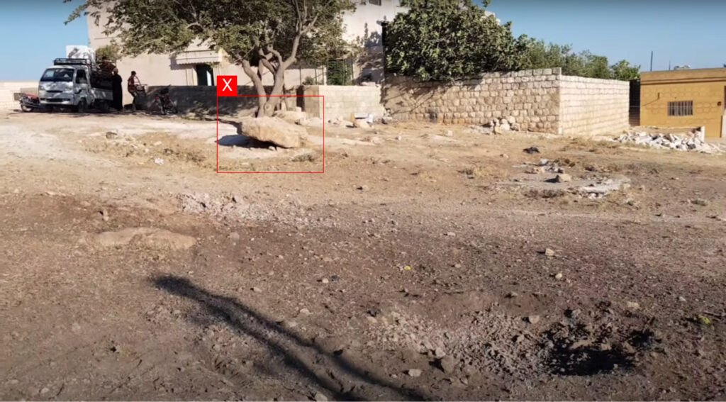 Reports of the incident mention the village of Mantef (منطف). Analyzing audio-visual material from sources, we have narrowed down the location of this strike at these exact coordinates: 35.777234, 36.651806.