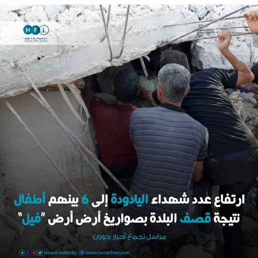 According to the Syrian Observatory for Human Rights, “a woman and her little son and three other children in al-Yadouda” were killed. Syrian Network for Human Rights also reported that five civilians were killed from the same family, including three children and a woman while @DaraaMartyrsOF identified that among the five killed included “a man, a woman and 3 children from the same family”.