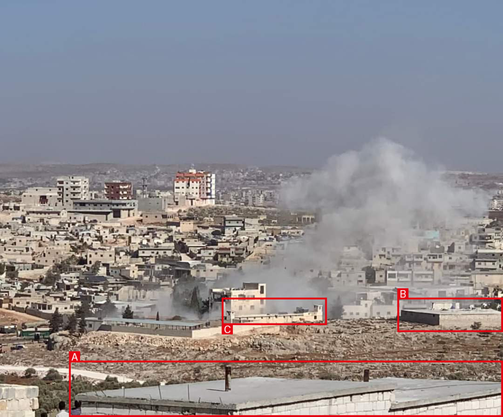 Reports of the incident mention a government facility being struck near the old Bab Al Hawa square (ساحة باب الهوى القد) in the city of Sarmada (سرمدا). Analyzing audio-visual material from sources we have narrowed down the location to exact coordinates.