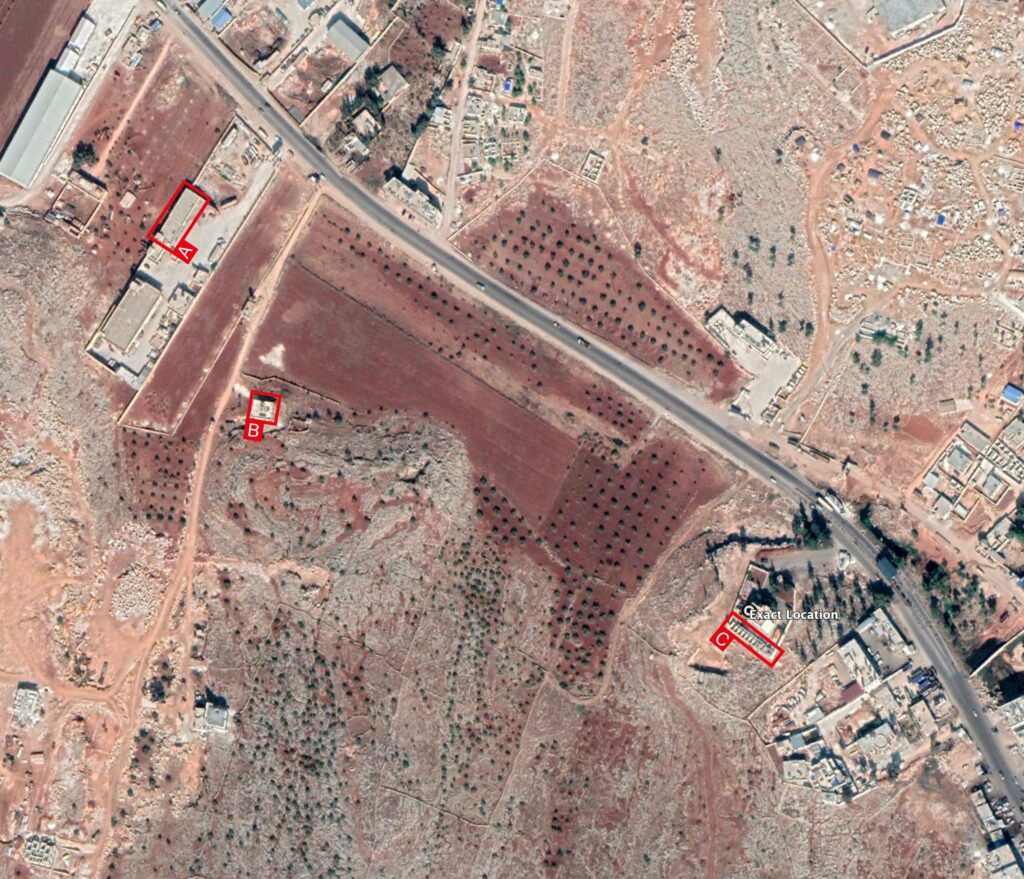 Reports of the incident mention a government facility being struck near the old Bab Al Hawa square (ساحة باب الهوى القد) in the city of Sarmada (سرمدا). Based on imagery available to Airwars, a potential set of coordinates for the strike are: 36.204324, 36.724478.
