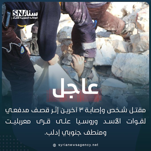 The Syrian Civil Defense reported that one civilian was killed and three others were injured in alleged artillery shelling by the regime and Russia on Marblet and Mantaf without specifying in which village the casualties occurred. El Dorar put the number of civilians injured in Marblet and Mantaf at five.