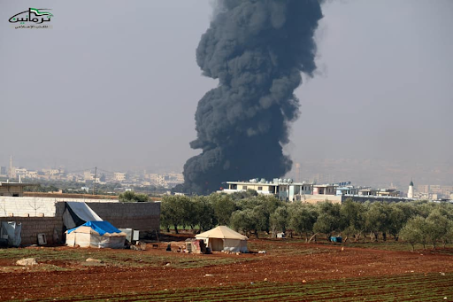 Syrian Civil Defense also provided details that the shelling occurred in the Hazra area located between the town of Termanin and the city of Dana. Syrian Observatory for Human Rights reported that the fuel market that was bombed belonged to “Watad petrol company” and Zaman Al Wasl identified the “widows camp” as being Al-Domani camp for the displaced.