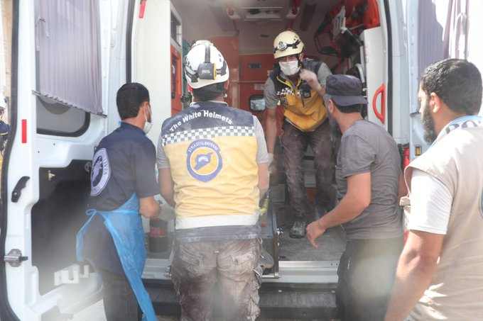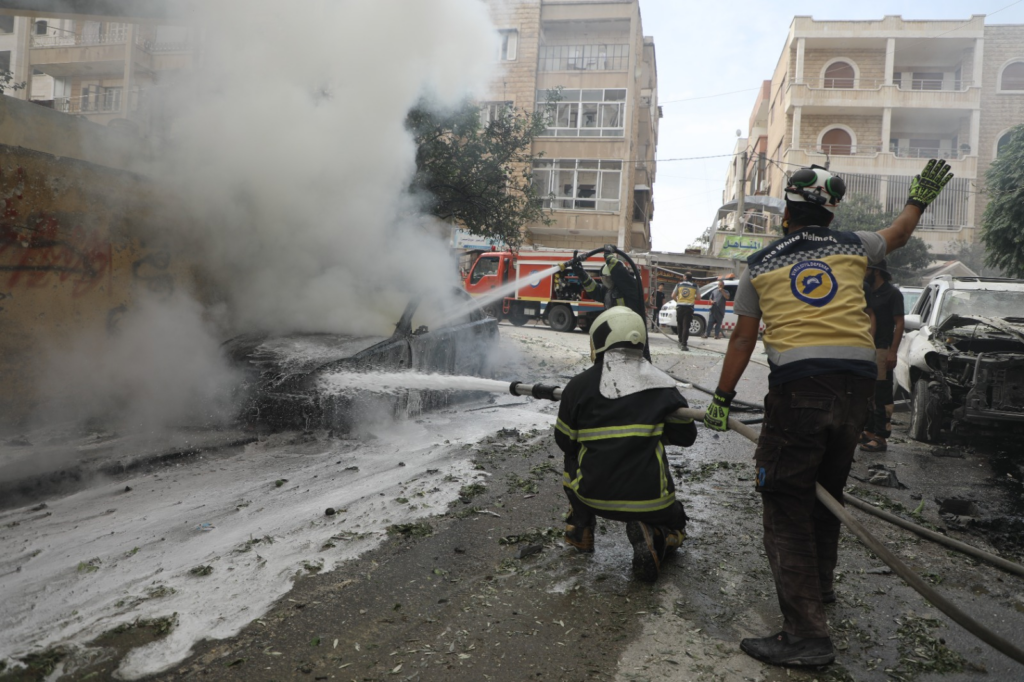 The number of the injured was later updated to 31, apparently after the afternoon attack that the SCD reported in the afternoon around 1:14 PM. SCD tweeted that “a civilian was killed and two women were injured in the initial toll of renewed missile bombardment by regime forces on the city of #Idlib this afternoon.” It added that a cluster of medical facilities in the city were hit and a fire broke out in a civilian’s car. The attached images showed a car trapped in a fire and several SCD volunteers extinguishing it. In another tweet, SCD posted a video showing the fight against fire and also the transportation of an injured man to the ambulance.