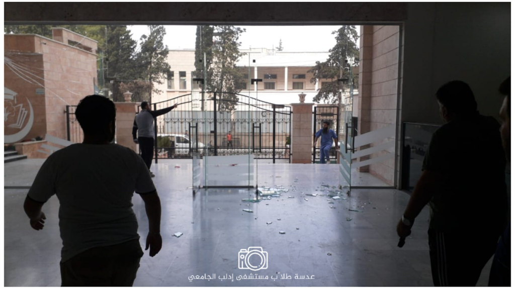 A Facebook account of the Lens of Idlib University Hospital students reported the targeting of the Ibn Sina University Hospital, noting “fear and panic” resulting from the attack and shared a picture of the broken glass windows.