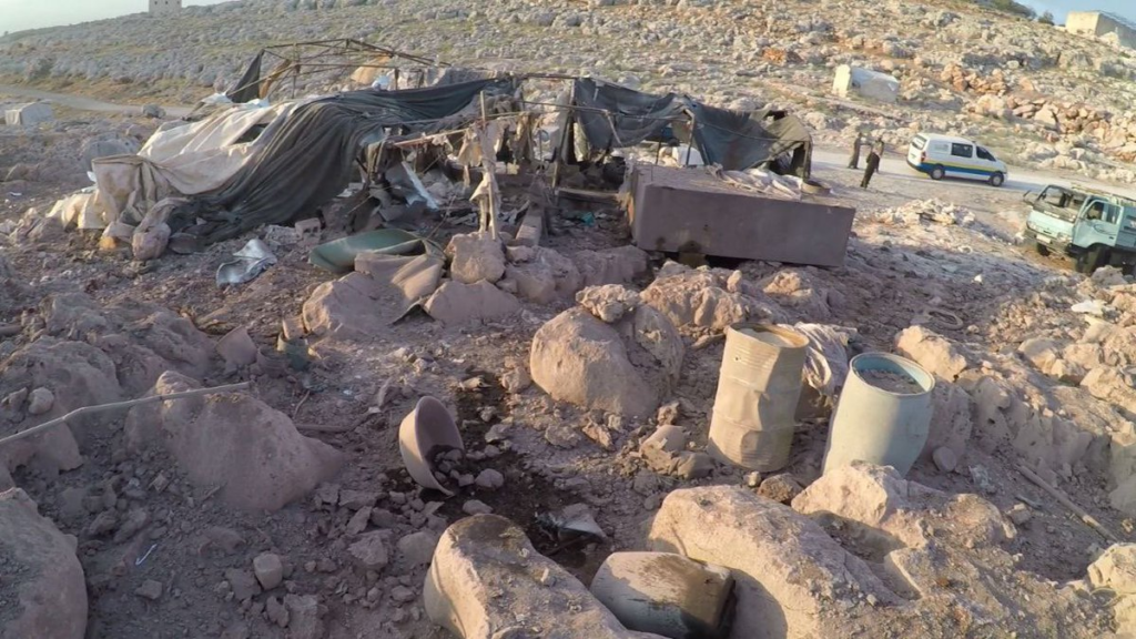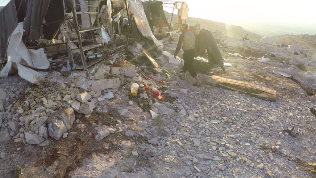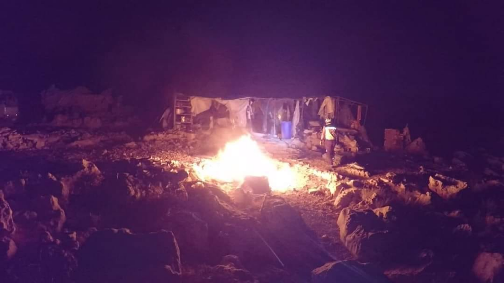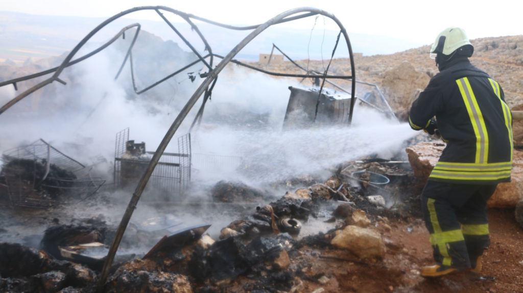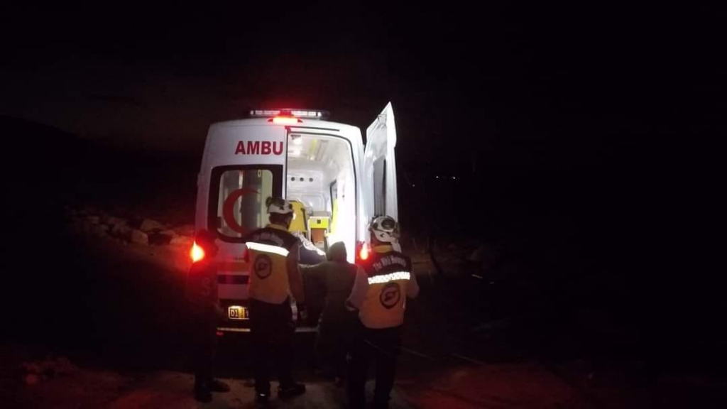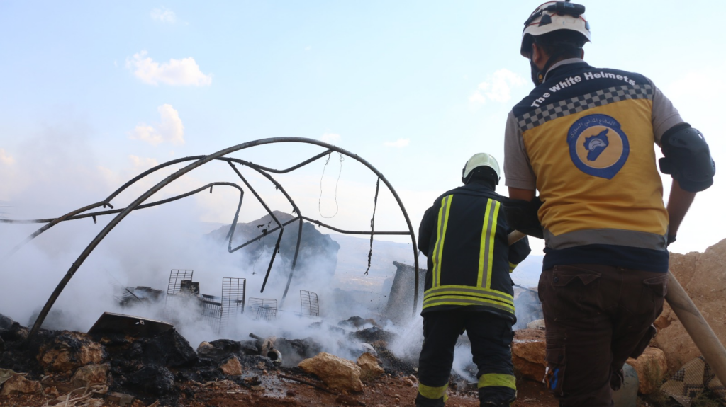 The damage caused by the airstrikes involved the burning of two tents and damage to civilians’ homes as a result of the pressure of the explosions caused by the air strikes. On Twitter/X, @SyriaCivilDefe posted images of the White Helmets volunteers extinguishing a tent fire caused by the air strikes and an ambulance, both captured in the early morning darkness. The SCD also posted a video showing the tents that were burnt and an injured woman lying on the ground treated by the SCD volunteer.