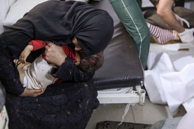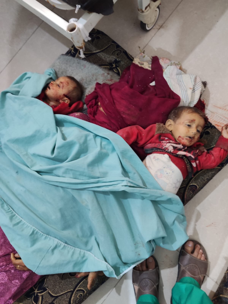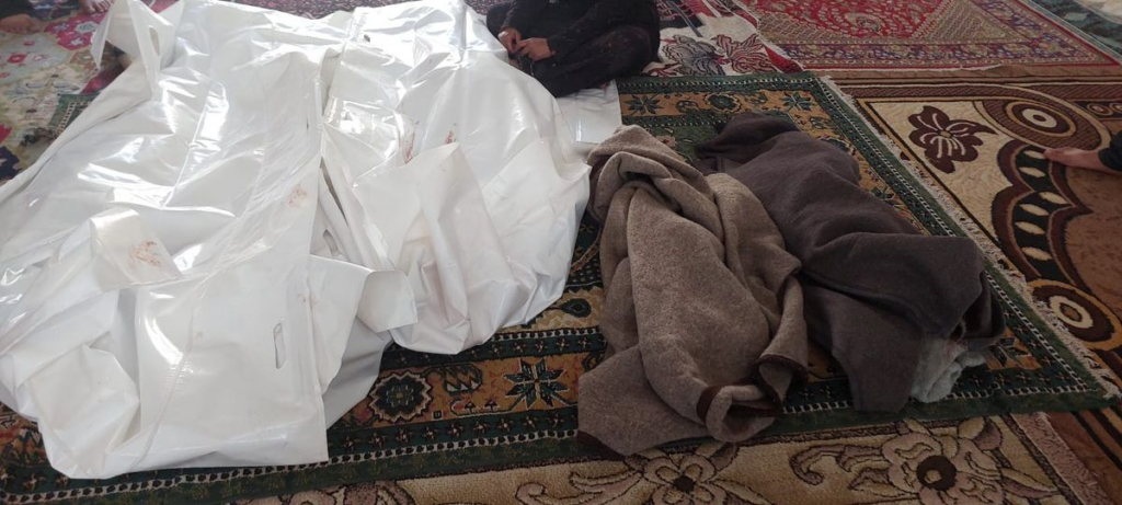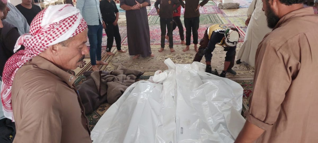 SCD also shared two disturbing videos showing the scale of the human tragedy. One video was of a woman belonging to the same family as the victims (apparently a mother of the two perished sisters) who was loudly crying in despair, surrounded by the shrouds of her two daughters, her two grandchildren, and her mother. This woman was also interviewed by Orient News correspondent. Another video showed screams of the wounded child who was crying: “I want to see my mother, please tell me my mother.”