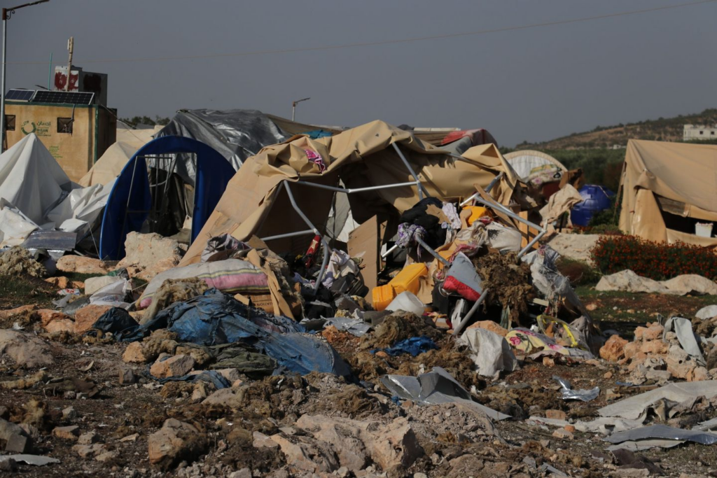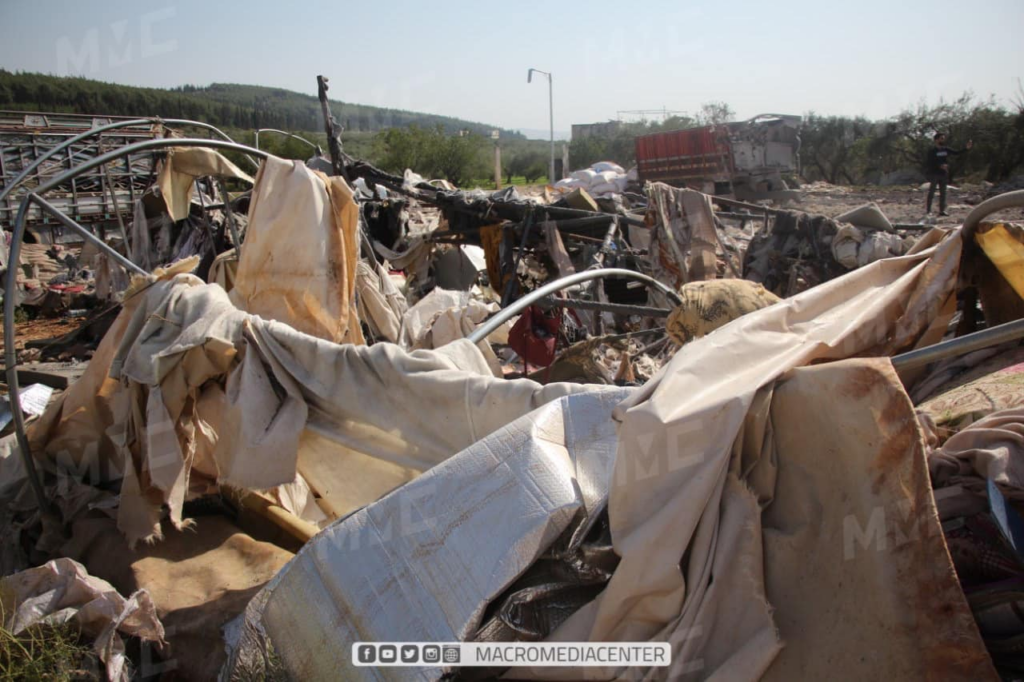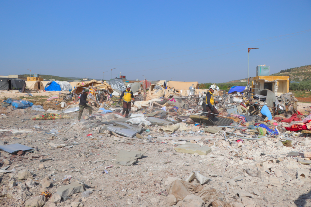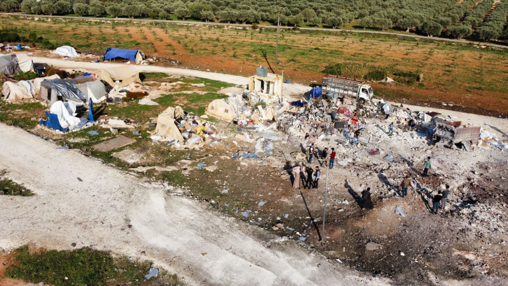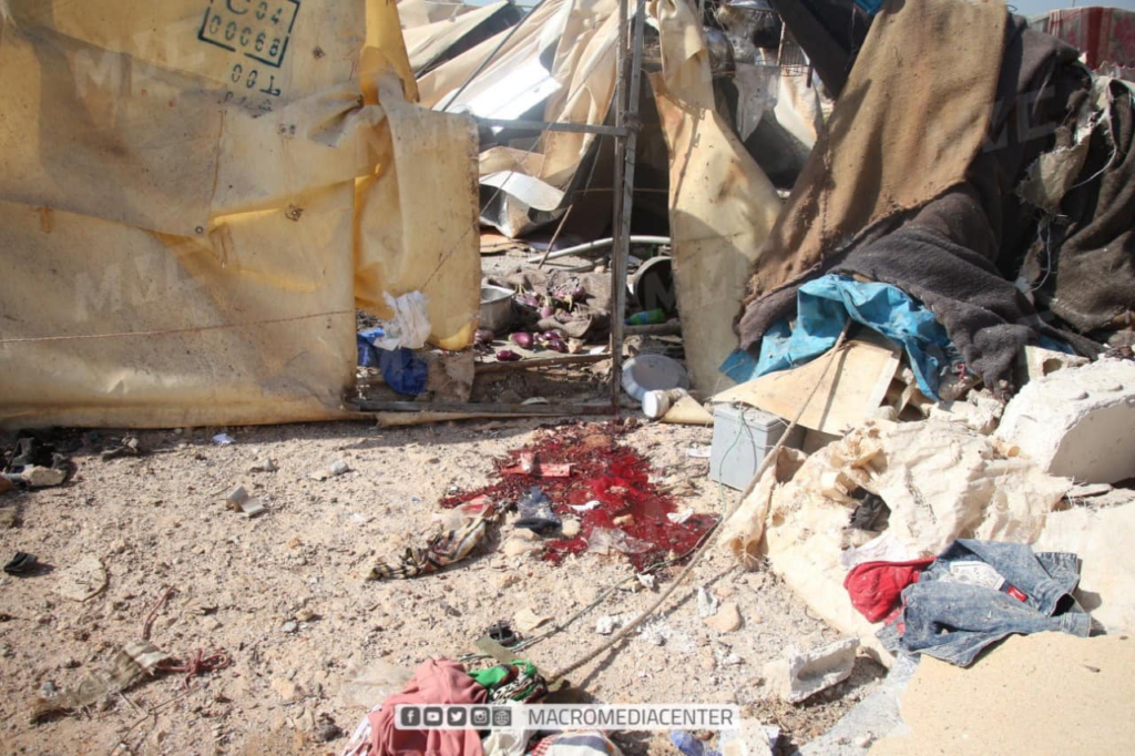 Several photos of the camp shared on social media showed it had been largely destroyed by the strike, with objects and tents buried under the rubble as well as large traces of blood. A touching image shared by SCD featured a toy bear amidst the rubble and an empty milk bottle. Syrian Civil Defense wrote: “A sad night, the toy spent inside the child’s bed, far from its owner, whose soul was kidnapped by the Russian terrorist machine, so that his trace disappeared and the milk bottle and his toy remained witnesses to the massacre.”