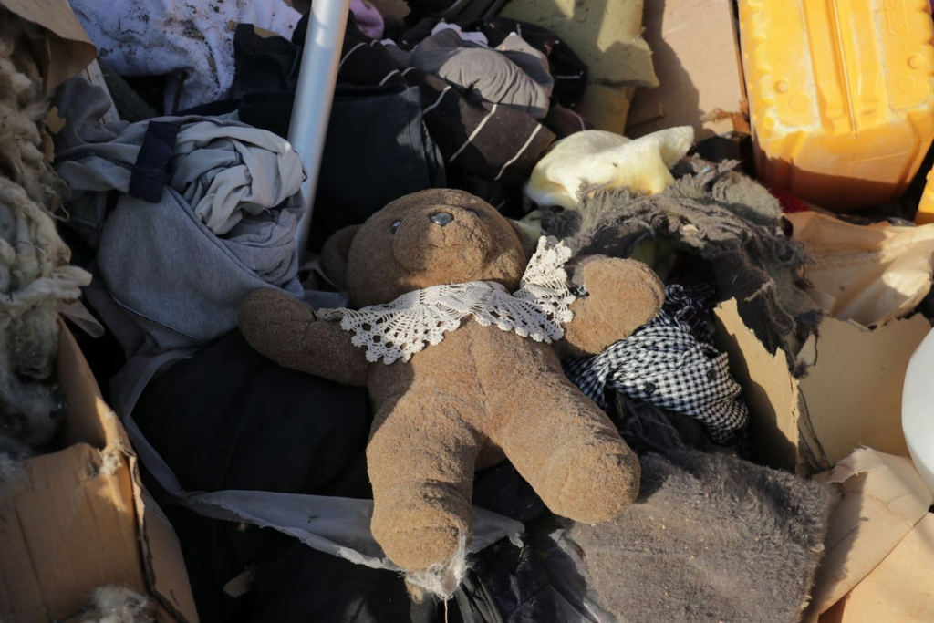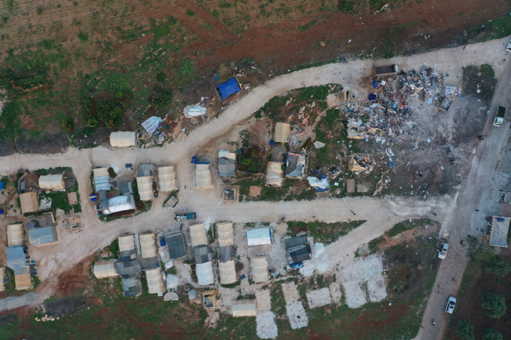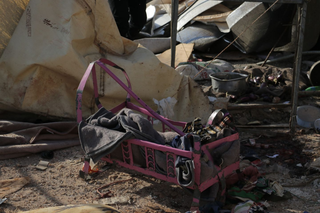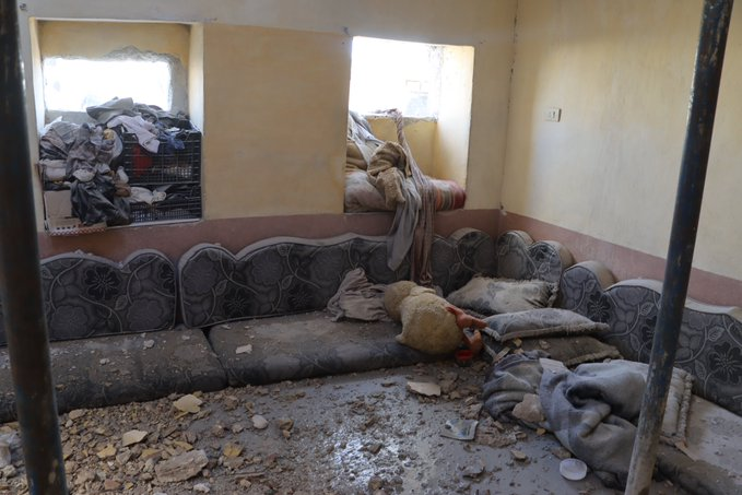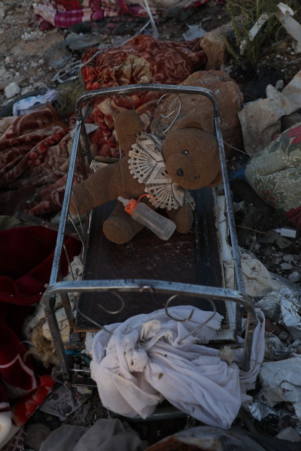 Several photos of the camp shared on social media showed it had been largely destroyed by the strike, with objects and tents buried under the rubble as well as large traces of blood. A touching image shared by SCD featured a toy bear amidst the rubble and an empty milk bottle. Syrian Civil Defense wrote: “A sad night, the toy spent inside the child’s bed, far from its owner, whose soul was kidnapped by the Russian terrorist machine, so that his trace disappeared and the milk bottle and his toy remained witnesses to the massacre.”