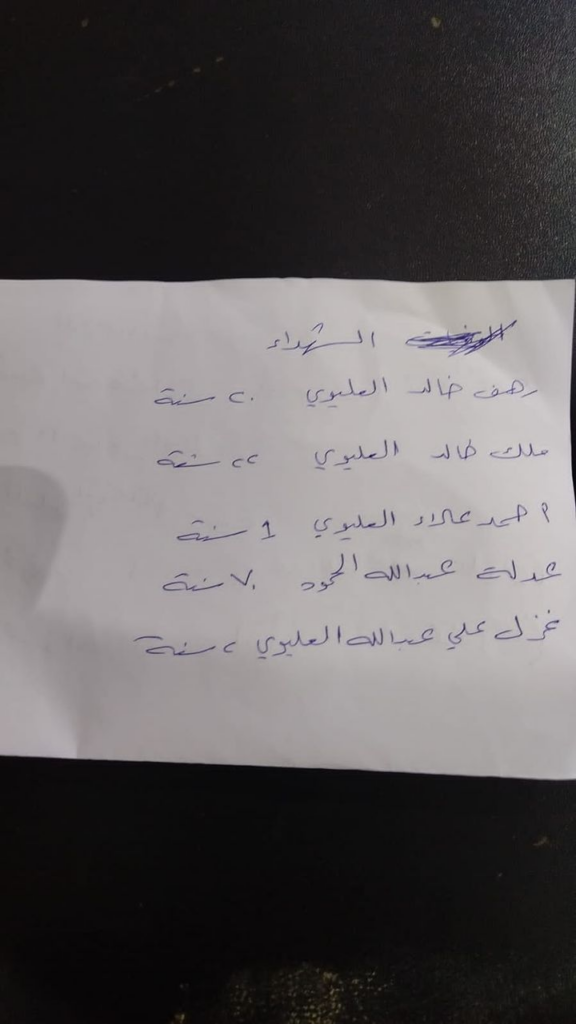 Namely, two young siblings were killed in the attack, a girl Rahaf Khaled Al Alewi and Malak Khaled Al Alewi. Among the deaths were also Ahmad Alaa Al Alewi, apparently a brother of the injured Abdullah and Khaled (identified below), Adla Abdullah Al Hamoud, and Ghaza Ali Abdullah Al Alewi.
