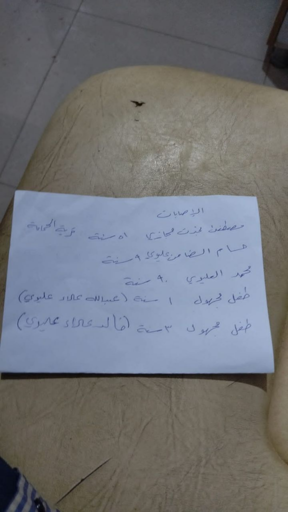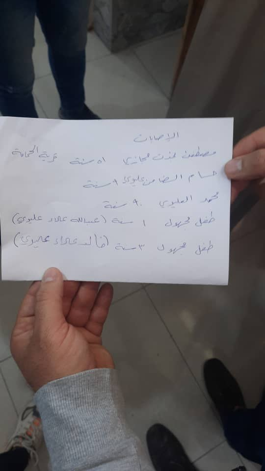 Among the injured civilians the sources named Housam Al Damen Al Alewi, Mustafa Najdat Hijazi, Mohammed Al Alewi, and two children – a one-year-old boy Abdullah Alaa Alewi and a three-year-old boy Khaled Alaa Alewi.