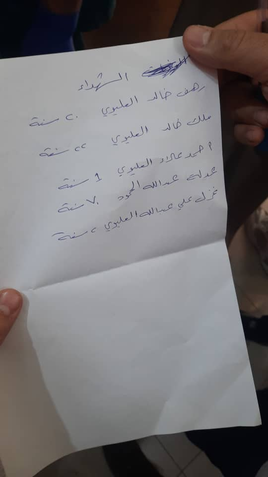 A Facebook post by Ramez Mustafa Bakir containing an image of a piece of paper with Arabic names of the victims helped Airwars identify some victims’ names.
