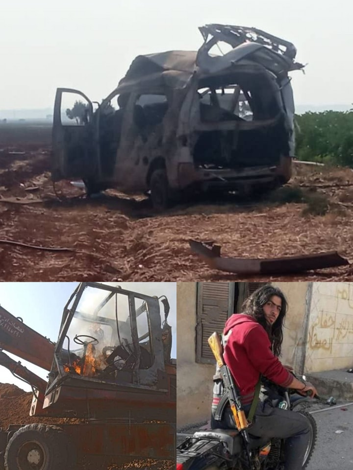 Syrian Military Capabilities claimed in their Facebook posts that “Armored hunters in the #Syrian_Arab_Army destroyed a number of terrorist vehicles in the eastern Idlib axis (Taftanaz – Efes) and killed and wounded a number of terrorists as a result” while journalist Ahmad Kareem Tebi posted on Facebook that the Syrian regime military “fire-block the routes of movement of militants…destroying and damaging a number of their vehicles, which led to the killing and wounding of a number of them.” The journalist shared images of the burnt Baker vehicle as well as an image of a young long-haired man with a gun on his back. However, there was no further evidence that the pictured man was indeed Juma Abu Zohair, and none of the equipment destroyed was military in nature. Therefore, Airwars has classified Juma Abu Zohair as a civilian unless further information comes to light.