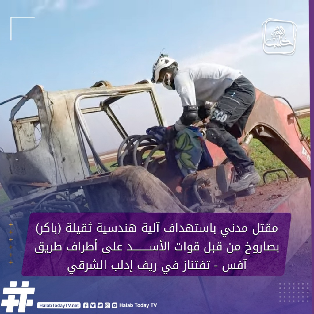 On the morning of Thursday, November 16th, 2023, a missile strike with contested responsibility allegedly perpetrated by Syrian regime forces and/or Russian military and/or Iranian military reportedly occurred along the Afes-Taftanaz road in the eastern countryside of Idlib, Syria, killing a young man Joumaa Abu Zohari who was reportedly operating a heavy engineering vehicle (Baker) at the time he was killed. Multiple local sources referred to “wounded” but did not specify how many.