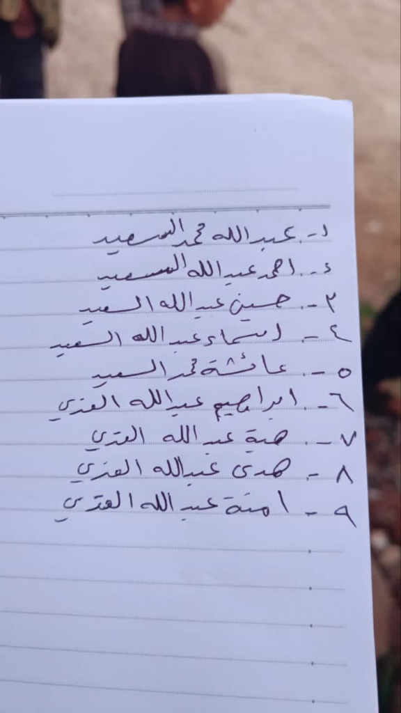 The Syrian Human Rights Committee (SHRC) news as well as the Facebook post by Omran Shnan included the names of the identified victims of the attack. 50-year old Abdullah Muhammad Al-Saeed, presumably Khadija Ibrahim’s husband, was killed together with their three children – four-year old Hussein Abdullah Al-Saeed, 12-year old Asmaa Abdullah Al-Saeed and 16-year old Ahmed Abdullah Al-Saeed. Among the victims was also 48-year old Aisha Muhammad Al-Saeed, 20-year old Ibrahim Abdullah Qadi, 15-year old Huda Abdullah Qadi, 16-year old Heba Abdullah Qadi and three-year old Amna Abdullah Qadi. It was reported by SHRC news that the tenth victim was not identified. The name of the child who died from the injuries later was not provided in the sources either.