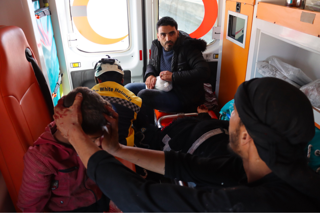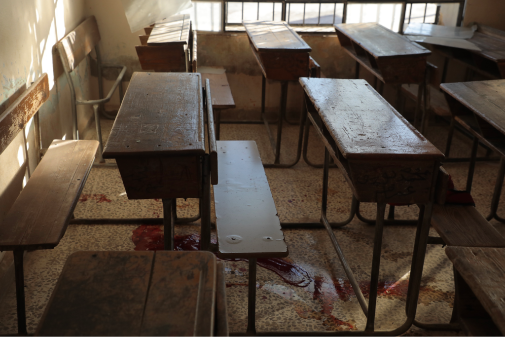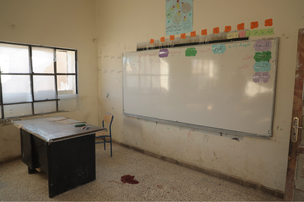 Photos from the scene shared by the Syrian Civil Defense showed an empty classroom with blood on the floor near the teacher’s desk and a student’s desk at the bottom of the room. Moreover, the schoolyard displayed remnants of the impact. Videos from the Syrian Civil Defense showed them attending to the scene, transporting victims to civilian cars and then to an ambulance for first aid before heading to the hospital.