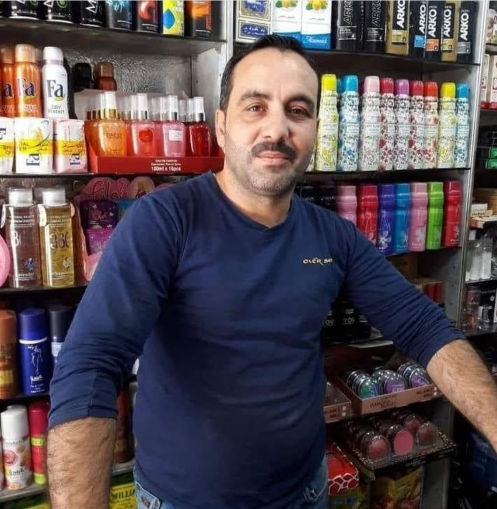 Abu Abdo Al-Malik wrote in his Facebook post that 43-year-old man Mahmoud bin Mohammed Amin died of his injuries inflicted as a result of the bombing of the Al-Dabait neighborhood of Idlib. He shared an image of the late Mahmoud – a middle-aged man with a mustache wearing a blue shirt standing in front of product shelves in a cosmetics store.