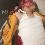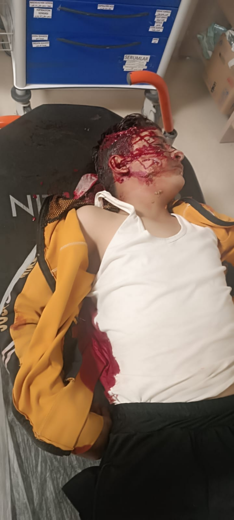 Facebook user Tadf posted graphic photos related to the alleged event. The first image depicted a young boy lying on a stretcher in what appeared to be a medical facility. His face was heavily bloodied, with visible injuries concentrated around his forehead, cheek, and nose. The wounds seemed severe, with dried and fresh blood covering significant portions of his face. In the area around his head, thick drops of fresh blood were glistening on the stretcher. He wore a white tank top, which was soaked in blood on the bottom left side, further highlighting the gravity of his injuries. A yellow jacket, partially unzipped, framed his torso. His eyes were closed, suggesting he might have been unconscious or in significant pain. In the background, a medical trolley stocked with labeled drawers reinforced the clinical setting and the urgency of care.