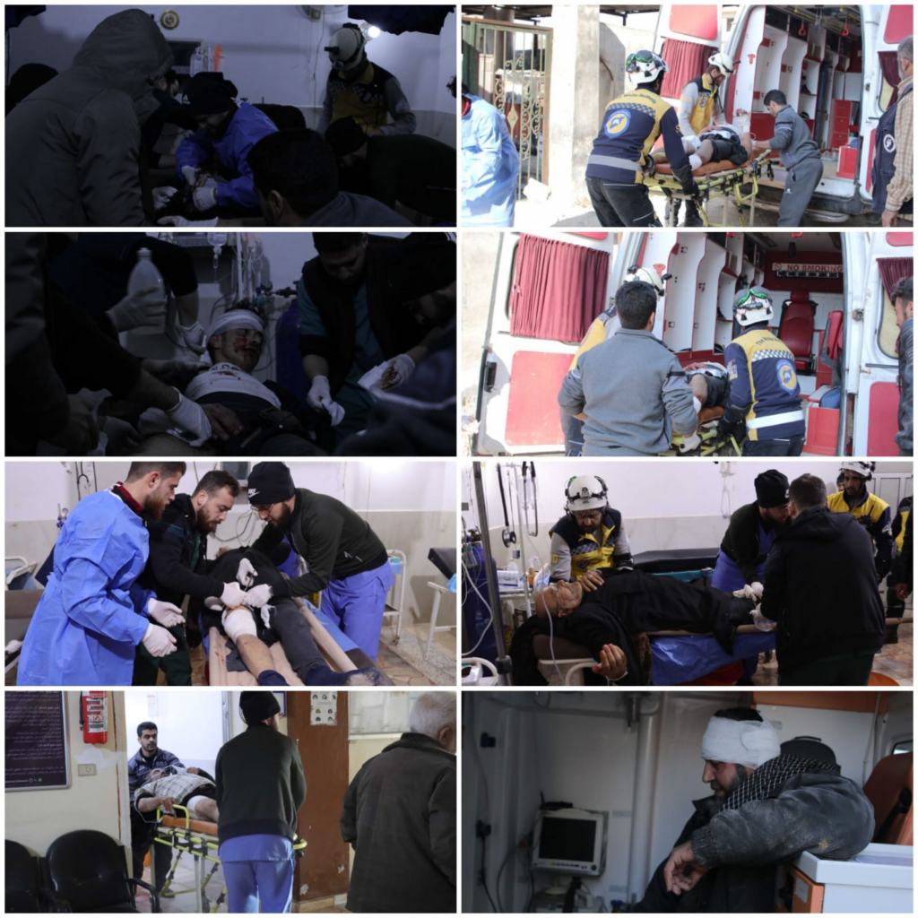 These harrowing images, shared by the Syrian Civil Defense (White Helmets) on their official platforms, depicted the immediate aftermath of the reported shelling in Sarmin, Idlib. In one particularly poignant photograph, a man with a head wound lies on a stretcher, his face contorted in pain as responders work diligently to stabilize him. Blood-soaked bandages and visible injuries emphasized the severity of the trauma inflicted during the attack. Another image highlighted a rescue worker, clad in the distinctive yellow and blue uniform of the White Helmets, carefully transferring an injured man into an ambulance. The tension in his posture reflected the urgency of the situation. Nearby, paramedics worked in unison to maneuver another victim, who was immobilized and bandaged, onto a stretcher, illustrating the sheer scale of casualties requiring attention. Inside a dimly lit emergency room, medical personnel surrounded a patient, their gloved hands moving quickly to administer life-saving care. The stark lighting and scattered medical equipment conveyed the urgency of the effort, while the somber expressions of the team reflected the emotional toll of their work. Another photograph captured an elderly man, wrapped in a heavy coat and scarf, sitting inside an ambulance with a vacant, distant expression—a haunting reminder of the psychological scars such events leave behind.