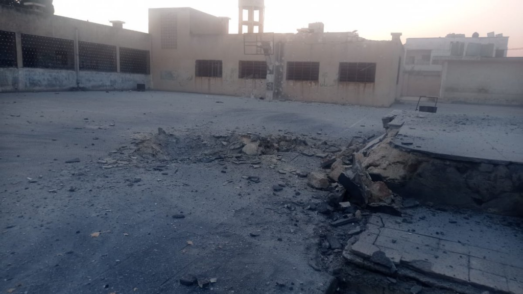 Another video shared by the Facebook account of the news outlet Al Mohrar showed the direct aftermath of the airstrike where thick clouds of white smoke are seen rising on the right side of the road. The photos provided by @SyriaCivilDefe and Atareb Media Office depicted precise and harrowing scenes of the destruction inflicted by the shelling. One image showed a vast, open schoolyard where a gaping crater had been carved into the asphalt, surrounded by chunks of concrete and scattered rubble. The damage extended to the school building itself, with shattered windows and cracks splintering its beige facade, revealing the immense force of the explosion that had struck dangerously close to an area meant for children.