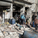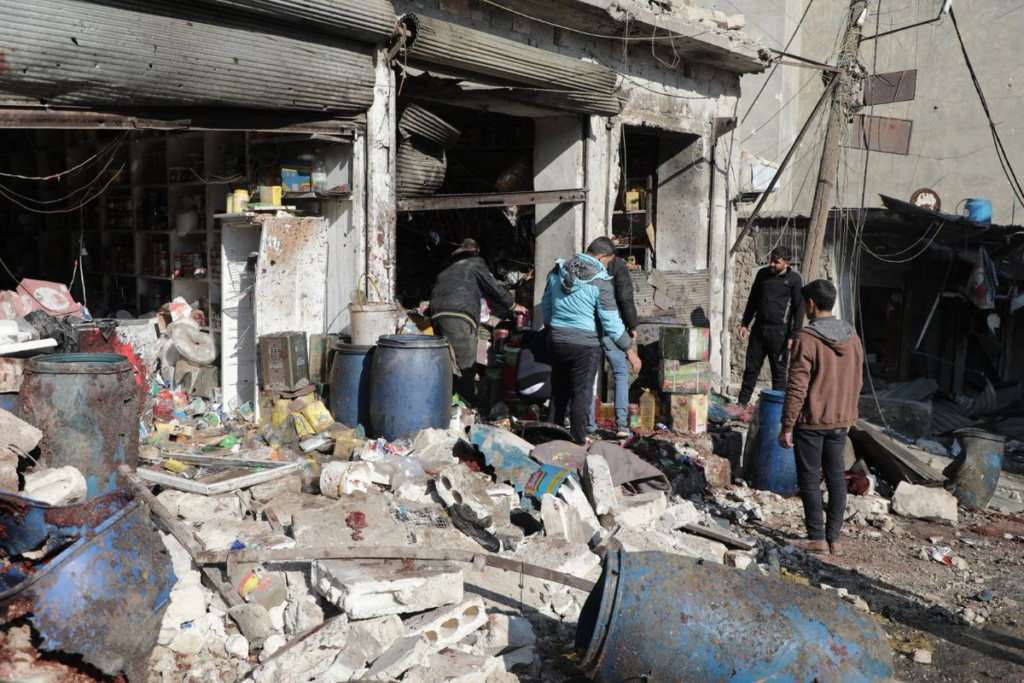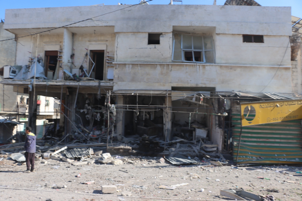 The Syrian Civil Defense posted photos showing the aftermath of the attack – the damaged buildings and market stalls with an ambulance standing nearby.