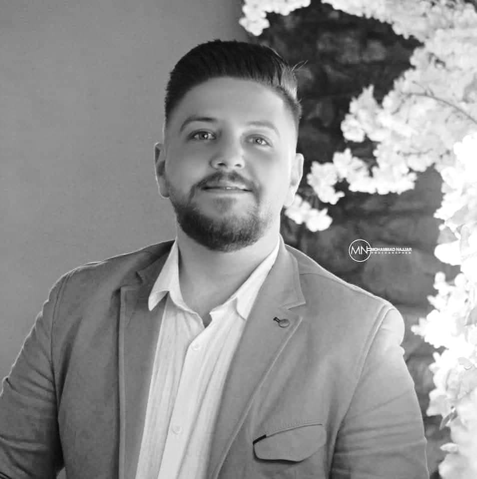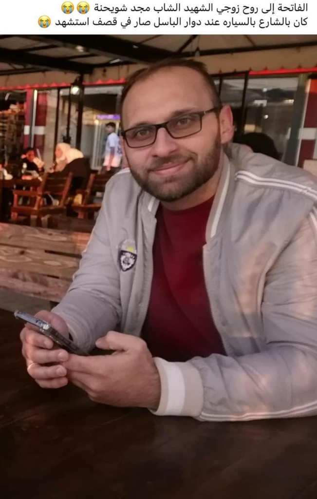 A Facebook post by Halid Abdo contained another image of Majed where he is seen sitting at the table, holding his phone and smiling at the camera. The inscription on the image, apparently written by his wife, read, “Al-Fatihah for the soul of my martyred husband, the young Majed Shuwaihna. He was in the street in his car near al-Basel roundabout, and there was a bombing, and he was martyred.”