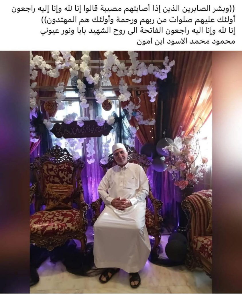 Haldi Abdo shared an image of Mahmoud Muhammad Al-Aswad ibn Amun who was an elderly man dressed in a traditional white thawb and wearing a white hat. He was pictured sitting on a beautiful chair in a pompous interior.” The inscription on the picture reads, “Al-Fatiha for the soul of the martyr, Baba and light of my eyes, Mahmoud Muhammad Al-Aswad ibn Amun.”