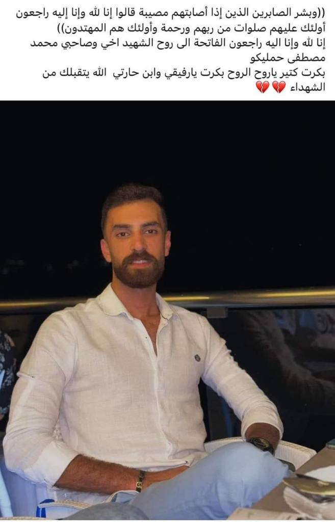 A young man, Muhammad Mustafa Hamliko, was also among the victims of the deadly strike. His image was shared by Halid Abdo in a Facebook post commemorating the victims, where he was a young man with short hair and a thick beard dressed in a white shirt and blue trousers, sitting in a cafe. The inscription on the picture read, “Al-Fatiha for the soul of the martyr, my brother and friend, Muhammad Mustafa Hamliko.”