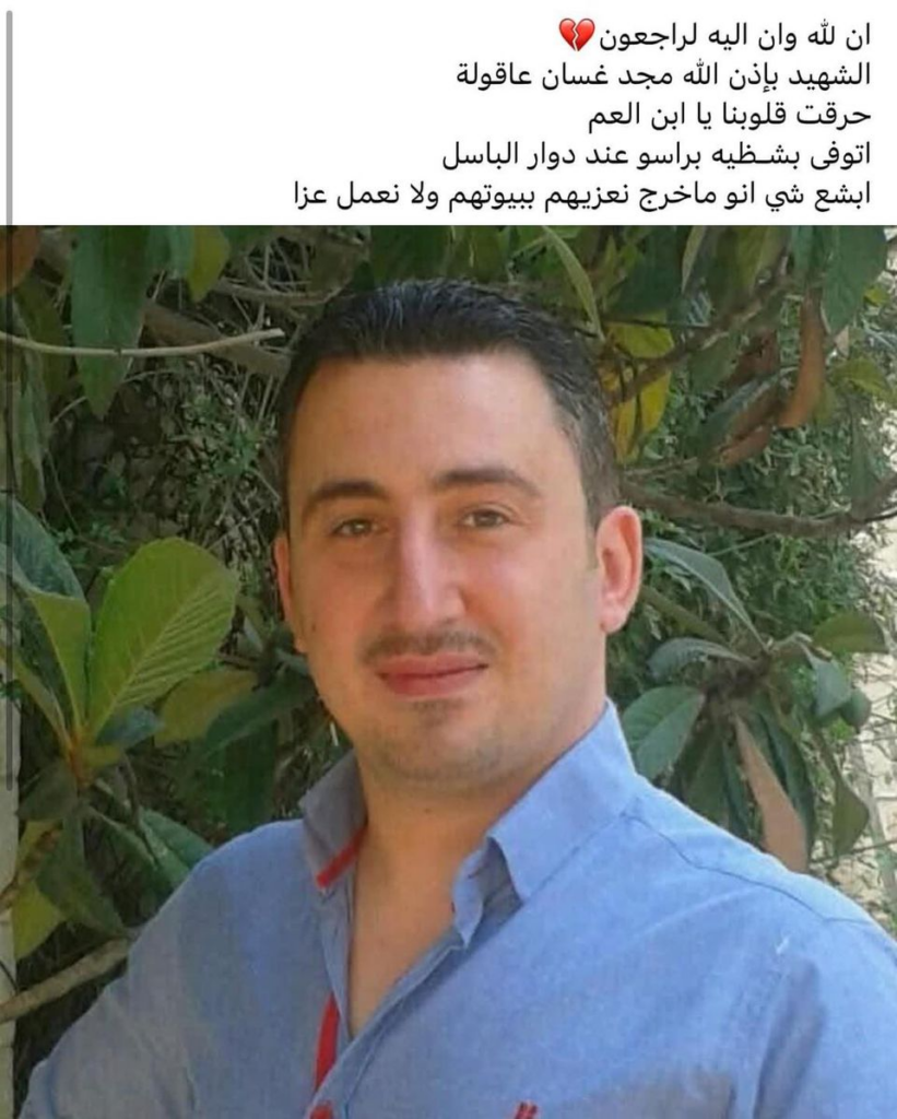 Majed Ghasan Aqoula was confirmed dead by social media sources; he had been a pharmacist whose image circulated in mourning posts. Majed reportedly died from a shrapnel wound to his head at the al-Basel roundabout. He was a young man pictured dressed in a blue shirt and standing in front of a large plant.