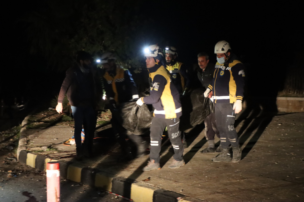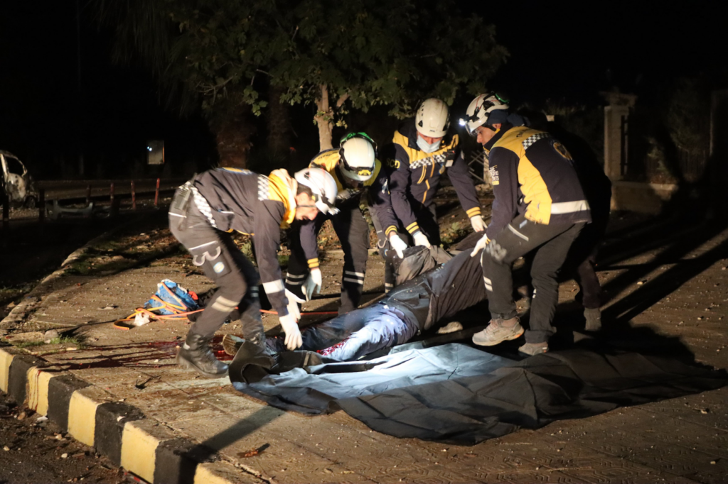 Another image showed five members of Syria’s Civil Defence—the White Helmets—surrounding the limp body of a civilian, lying face-up on the blood-streaked pavement. Helmets with mounted torches pierced the shadows, illuminating the scene. The victim, a man dressed in black, appeared to have suffered massive trauma. His lower leg had been torn open, his clothing soaked with blood. His body was contorted, one arm flung outward as if caught mid-motion in the moment of death.