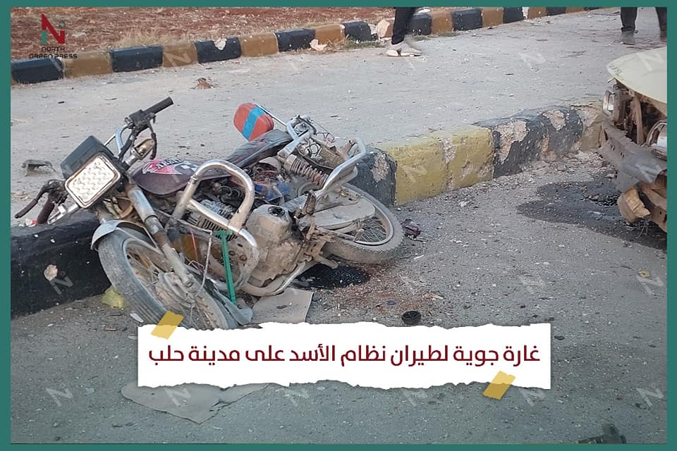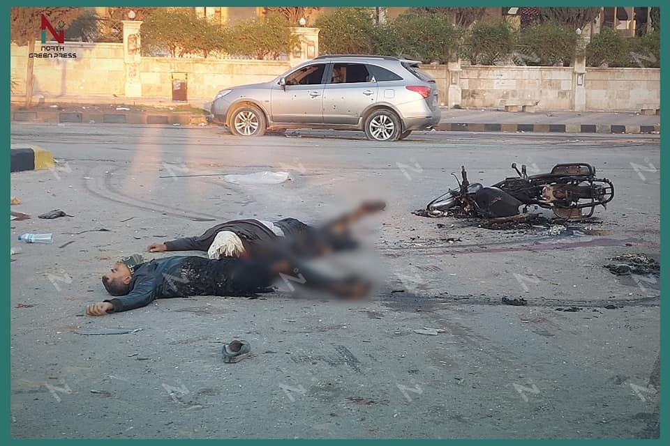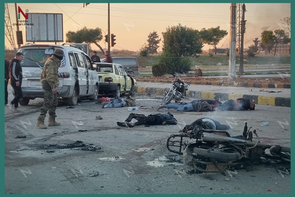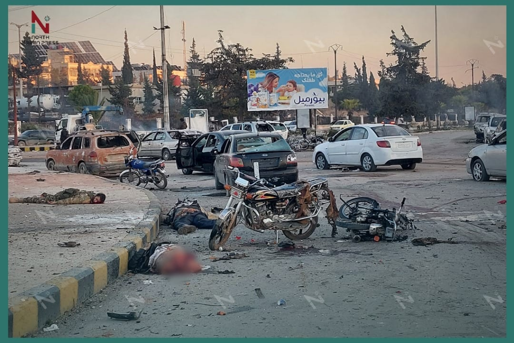 North Post shared additional images related to the event. One picture captured the brutal human toll of the airstrike at al-Basel roundabout in Aleppo. The foreground was strewn with lifeless bodies—civilian victims lying sprawled across the asphalt, their limbs limp and twisted in unnatural positions. One body near the curb showed signs of severe trauma, the face bloodied and the clothes torn. A second corpse lay motionless near a shattered motorcycle, surrounded by scattered debris and oil stains, suggesting a violent blast impact. In the center, a third body—clad in what appeared to be casual clothing—rested between two destroyed motorbikes. The individual’s posture, flat on the back with arms partially raised, conveyed the abruptness of the death. Another victim lay on the sidewalk, possibly a young man, the head turned toward the camera and blood clearly visible. The surrounding destruction, with blown-out cars and overturned bikes, underscored the indiscriminate nature of the strike.