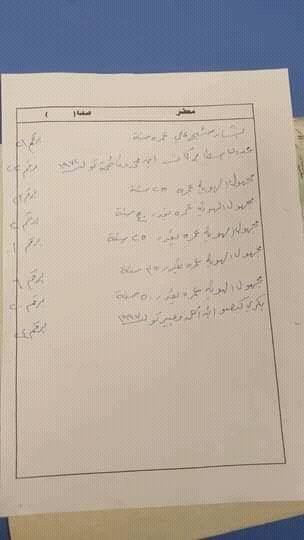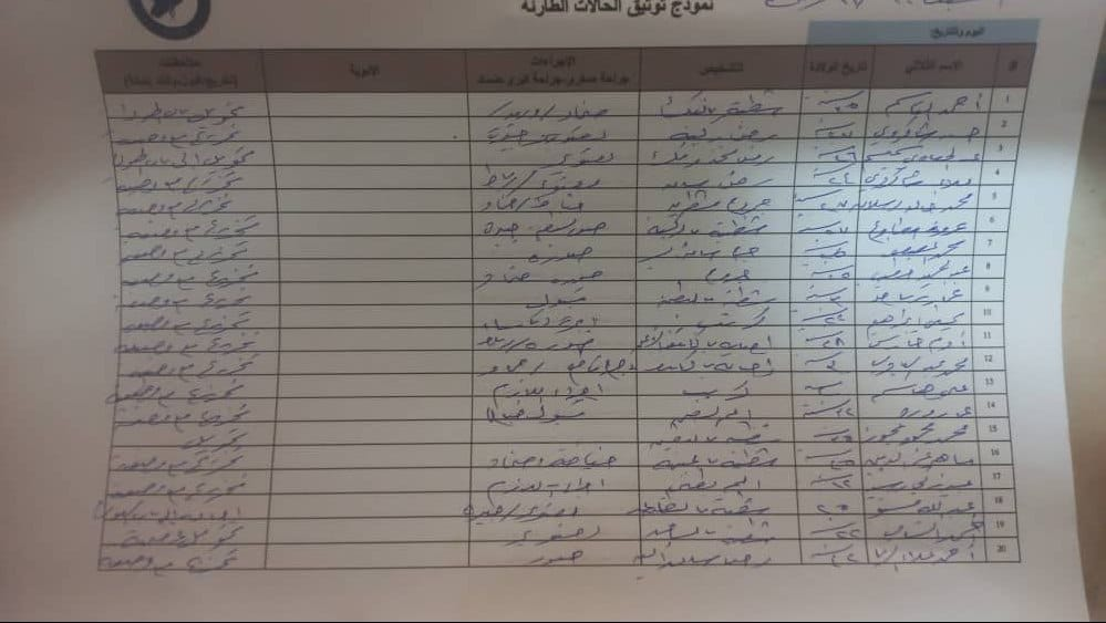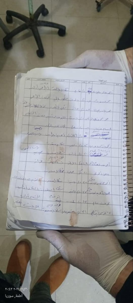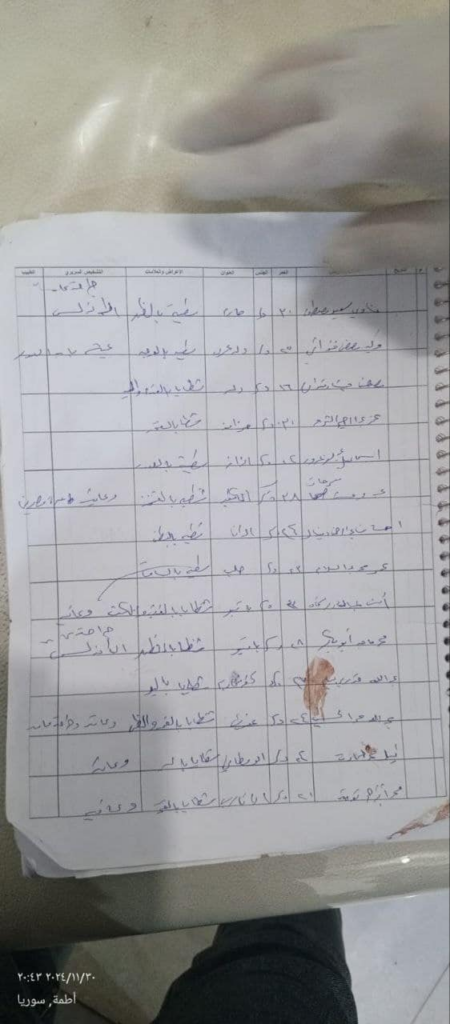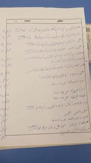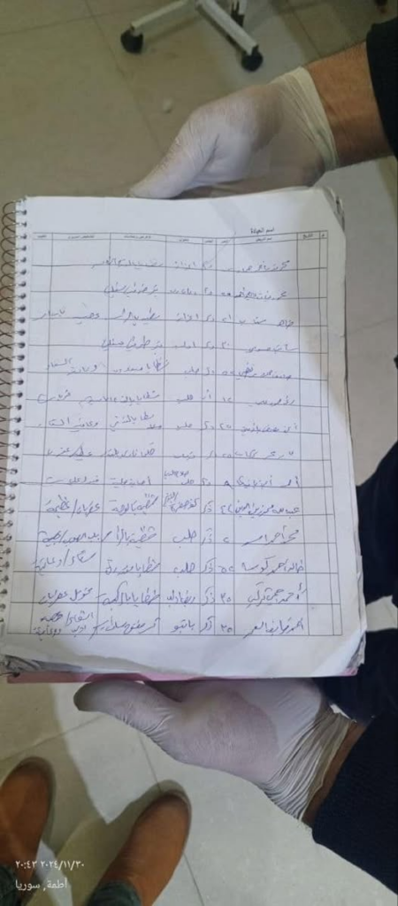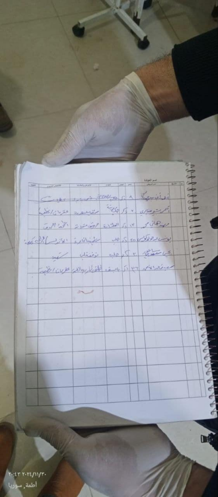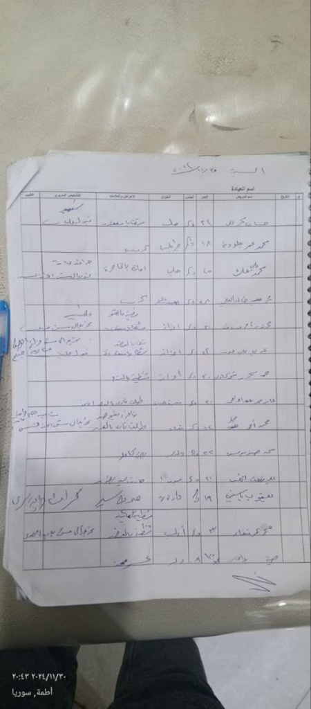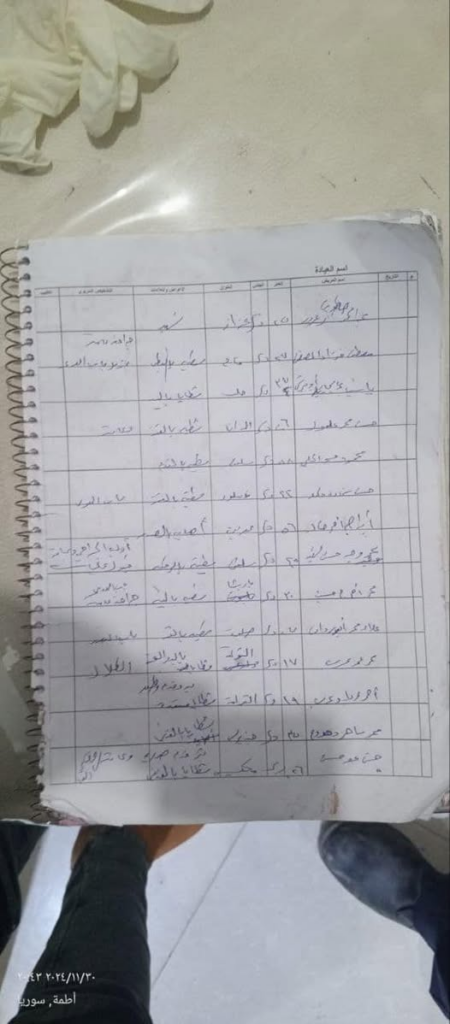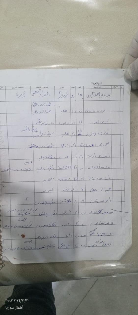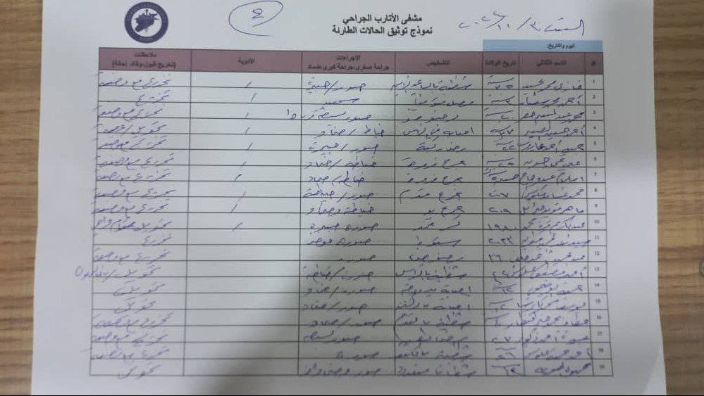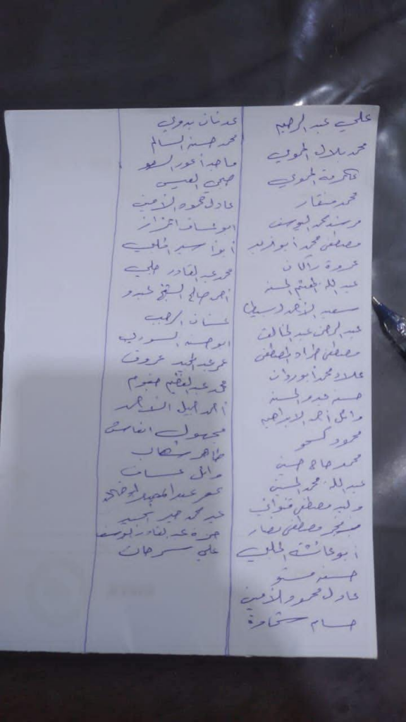 The first list of those in the University Hospital contained the name of the following 42 civilians – Ali Abd al-Raheem, Mohammed Bilal al-Hamawy, Akrima al-Hamawy, Muhammad Manqar, Murishid Mohammed al-Yousif, Mustafa Mohammed Abu Farid, Omar Warakan, Abdullah al-Hashem al-Musfir, Saeed al-Ahmed, Abdul Rahman Abdul Khaliq, Mustafa Tarad al-Mustafa, Alaa Mohammed Abu Rawan, Wael Ahmed Ibrahim, Mahmoud Kasho, Mohammed Haj Hussein, Abdullah Mohammed, Waleed Mustafa Qanawati, Hassan Mohammed Mustafa Nassar, Abu Aisha al-Halibi, Hassan Musto, Adel Mahmoud al-Amin, Hussam Shehadeh, Adnan Badwi, Muhammad Hussein al-Salem, Majid Awar al-Sattu, Subhi al-Issa, Adil Mahmoud al-Ameen, Abu Asdaf Izaz, Muhammad Abdul Qadir Ali, Ahmed Salih al-Sheikh Abdo, Ghassan al-Rajab, Abu Hassan al-Sori, Omar Abdul Majeed, Muhammad al-Azim, Ahmed Jamil al-Ahmed, Majhool al-Fasi, Tahir Shihab, Wael Assaf, Omar Abdul Majeed Abu Khaled, Eid Muhammad Khair, Hamza Abdul Qadir al-Youssef, and Ali Sarhan. There were two additional names listed that were not able to be transcribed.