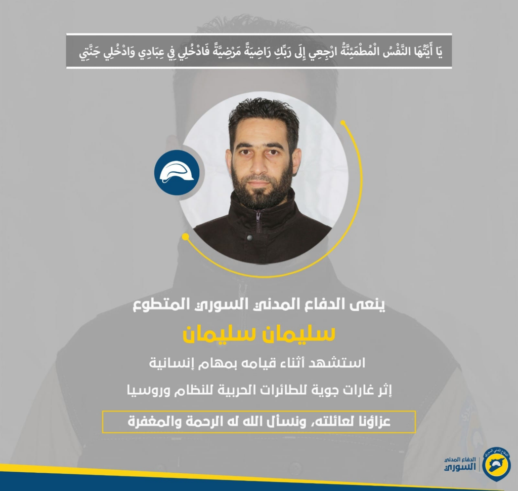 A Facebook post by Toledo city post named Suleiman Muhammad Suleiman Al-Hariri, a volunteer of the Syrian Civil Defence (also known as “White Helmets”), as a “martyr.” His death was reported by multiple sources, including a tweet by user @Re0Xp8FiZD8OMCJ, which gave more details about the man, claiming he came from the city of Taldou and was one of the “revolutionary activists” there.