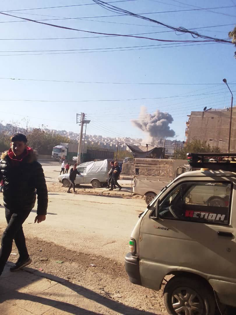 Initial information about the attack began circulating on Facebook at around 14:30. The few images available showed a large column of smoke and dust rising over the residential area. While no details have been given on the number and severity of casualties, a video posted on ORNET showed at least two wounded. The video showed several civilians on the street next to a damaged building, one of them, a teenager or a young man, limping with blood running from his forehead. A few seconds later, a group of people left the building, carrying a wounded man and loading him into a van.